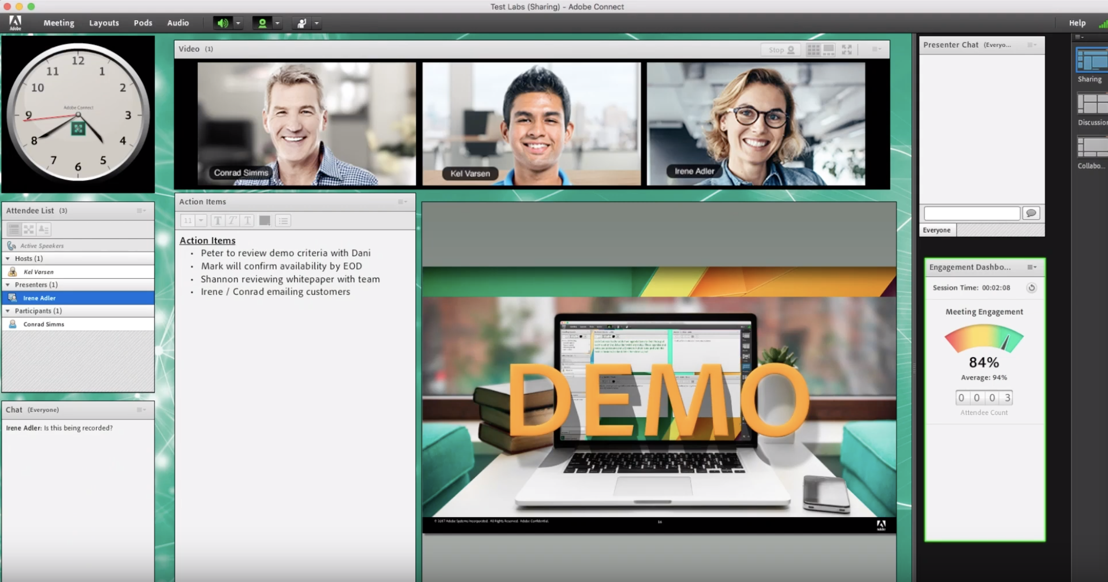 یک کلاس مجازی  Adobe Connect یک کنفرانس آنلاین زنده برای چندین کاربر است. اتاق جلسه یک برنامه آنلاین است که شما برای انجام یک جلسه استفاده می کنید. این شامل پاد های نمایشگر مختلف و مؤلفه ها است. چندین چیدمان اتاق جلسات از پیش ساخته وجود دارد. همچنین می توانید از یک طرح سفارشی متناسب با نیازهای خود استفاده کنید. اتاق جلسات اجازه می دهد تا شرکت کنندگان در جلسه؛ صفحه های رایانه ای یا پرونده ها ، چت ، پخش صوتی و فیلم را به اشتراک بگذارند و در فعالیت های آنلاین تعاملی شرکت کنند.