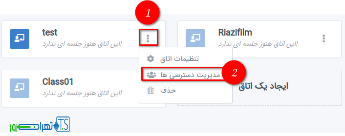 بعد از ایجاد اتاق بر روی علامت سه نقطه کنار آن کلیک و مانند تصویر زیر گزینه مدیریت دسترسی ها را انتخاب کنید: