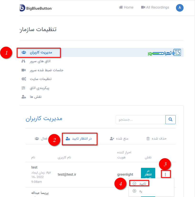 بعد از ساخت اکانت مجددا به اکانت ادمین وارد شوید و مسیر “سازمان >> مدیریت کاربران >> در انتظار تایید” را بروید: