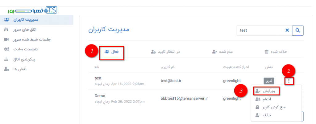 بعد از پیدا کردن کاربر مورد نظر مانند تصویر بالا بر روی علامت سه نقطه کنار آن کلیک و گزینه ویرایش را انتخاب نمایید.