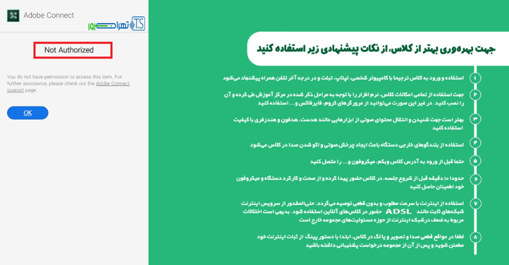 اگر ادمین پنل ادوب کانکت هستید و میخواهید فایل ضبط شده یکی از کلاس ها را ذخیره یا دانلود نمائید، ممکن است با خطا روبه رو شوید. چرا که برای این کار باید نام کاربری شما در کلاس اضافه و دسترسی میزبان بگیرد. برای رفع خطای Not Authorized هنگام دیدن کلاس های ضبطی، به صورت کامل در راهنماهای قبلی توضیح دادیم. این ارور معمولا به دلیل عدم دسترسی شما به آن قسمت نمایان میشود.