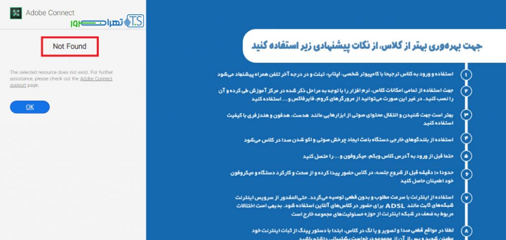 اگر میزبان و یا دانش آموز هستید و در زمان دیدن فایل کلاس ضبط شده با خطای Not Found مواجه میشوید، به این معنا است که این فایل از کلاس و یا پنل AdobeConnect حذف شده است و قابل دیدن نمیباشد.