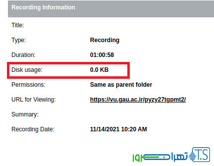 اگر در بخش disk usage که همان فضای اشغالی می باشد، عدد 0 قرار گیرد، به این معنیست که فایلی موجود و قابل دیدن نمیباشد و هیچی چیزی ذخیره نشده است. که در این حالت متاسفانه برای رفع مشکل راهی وجود ندارد. و باید کلاس مجدد برگزار و دوباره ضبط و ذخیره شود.