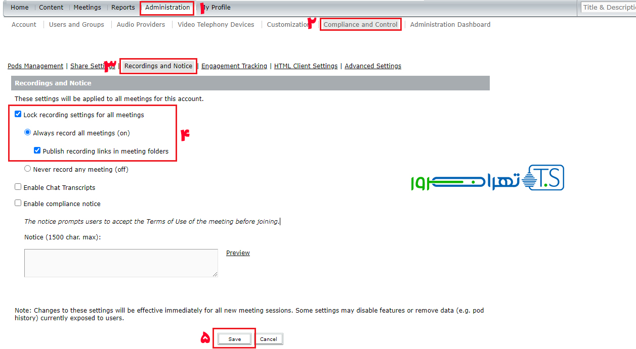 باید تب Recordings and Notice را انتخاب کنید. از این بخش تیک گزینه Lock recording setting for