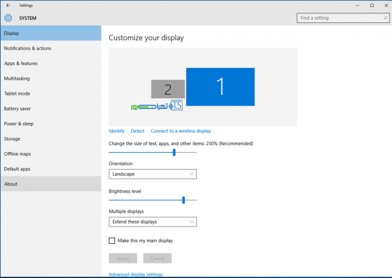 در این صفحه بر روی گزینه Detect کلیک کنید تا ویدئو پروژکتور به عنوان مانیتور دوم شناخته شود. و در قسمت Multiple displays گزینه Extend these displays را انتخاب نمایید تا هر دو مانیتور همزمان با هم فعال باشند.