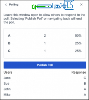 وقتی همه یا اکثر شرکت کنندگان به نظرسنجی پاسخ دادند ، روی انتشار نتایج نظرسنجی کلیک کنید و درنهایت مجموع نظرسنجی در جلسه نشان داده می شود.