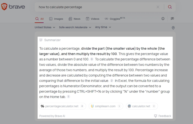اگر با مرورگر Brave آشنا باشید احتمالا از شنیدن نام Brave Search نیز متعجب نخواهید شد. Brave Search یک موتور جستجوی متمرکز بر حریم خصوصی است که جستجوی خصوصی و ناشناس را ارائه می دهد. می توانید آن را در داخل یا خارج از مرورگر وب Brave استفاده کنید. بر خلاف برخی دیگر از موتورهای جستجوی کوچکتر، Brave از فهرست و الگوریتم های وب خود استفاده می کند. اما می‌توانید «Google Backback» را فعال کنید. این بدان معناست که Brave گوگل را نیز بررسی می کند تا نتایج دقیق تری ارائه دهد. ویژگی Summarizer آن (که در تصویر مشخص است) یک ابزار مبتنی بر هوش مصنوعی است که پاسخ‌ های مستقیم را در نتایج جستجو ارائه می‌ کند.