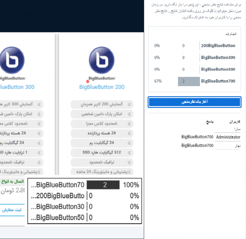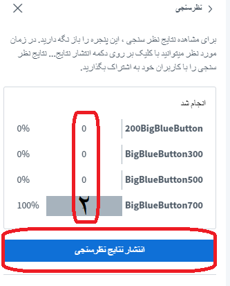 اساتید در BigBlueButton میتوانند در هنگام تدریس و یا در ابتدای آن برای رای گیری و نظرسنجی درباره اینکه چه موضوعی را امروز تدریس کنند؟ یا تدریس امروز چگونه بود؟ و…. از کاربران و شاگردان نظرسنجی کنند.