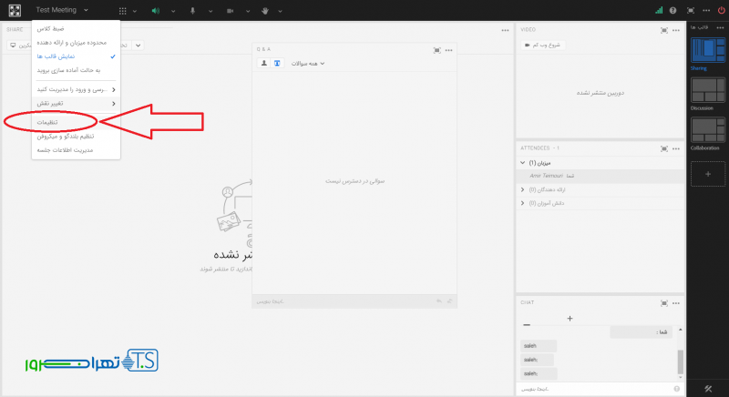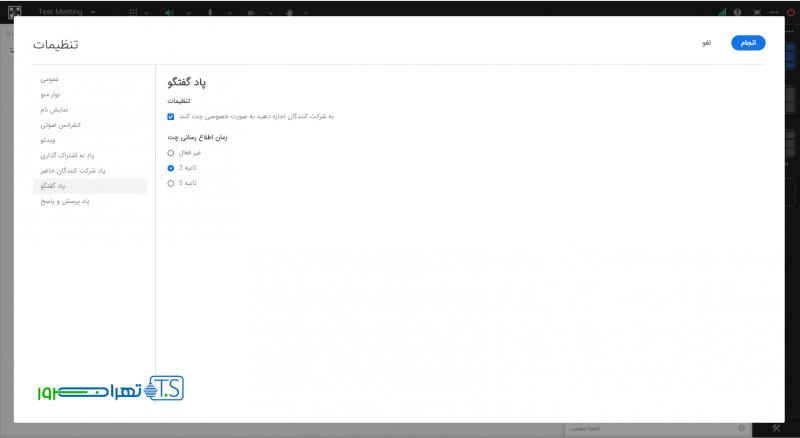 در زبانه “پاد گفتگو” دسترسی شرکت کنندگان به قابلیت چت خصوصی را کنترل می نمایید.