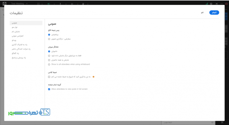همانطور که در تصویر زیر مشاهده می کنید بخش تنظیمات ادوب کانکت تحت وب به طور کامل به فارسی ترجمه شده است و با
