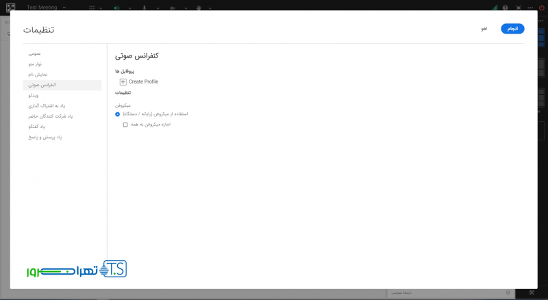 در زبانه کنفرانس “صوتی” می توان پروفایل هایی برای کنفرانس صوتی ساخت که هرکدام با دسترسی هایی