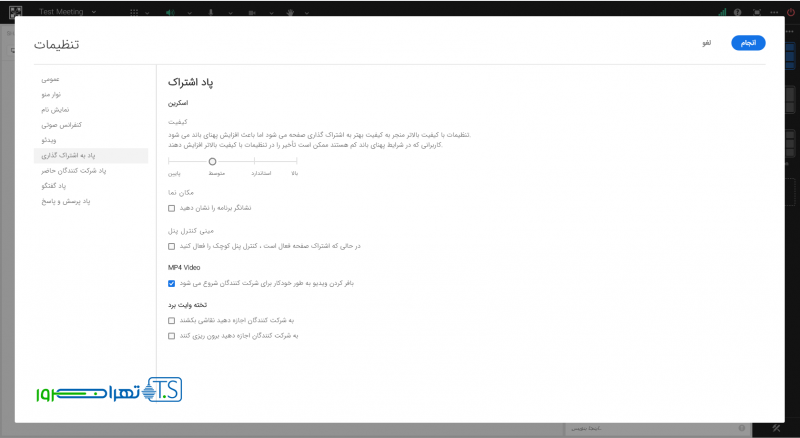 در زبانه “پاد اشتراک گذاری” می توانید کیفیت اشتراک گذاری صفحه نمایش و یا تنظیماتی در خصوص تخته