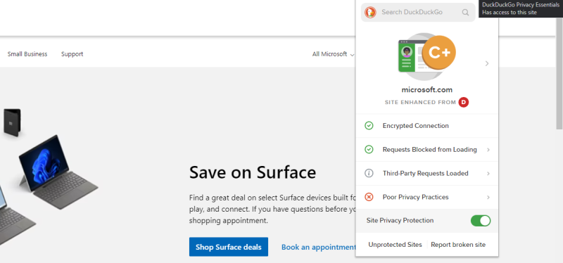 افرادی که در پشت موتور جستجوی DuckDuckGo به حریم خصوصی فکر می کنند همان کسانی هستند که افزونه Duck Duck Go Privacy Essentials را ارائه می دهند. هدف این افزونه کروم مسدود کردن کوکی های شخص ثالث و ردیاب های پنهان است. از انگشت نگاری سایت ها برای به دست آوردن جزئیات خاصی درباره مرورگر و سیستم شما جلوگیری میکند. همه سایت ها را مجبور میکند از رمزگذاری HTTPS استفاده کنند و موتور جستجوی پیش فرض شما را روی DuckDuckGo تنظیم می کند.