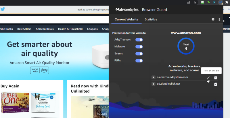 برای محافظت از امنیت و حریم خصوصی شما، Malwarebytes Browser Guard تلاش می کند. تبلیغات و ردیاب ها، بدافزارها، سایت های کلاهبرداری و برنامه های بالقوه ناخواسته (PUP) را مسدود کند. پس از نصب، این افزونه به طور خودکار سعی می کند از هرگونه محتوا و فعالیت مخرب یا ناخواسته از تأثیرگذاری بر مرورگر شما جلوگیری کند. اگر نماد Malwarebytes را انتخاب کنید و سپس روی دکمه Let’s Go کلیک کنید، می توانید یک وب سایت خاص را بررسی کنید. این افزونه نشان می دهد که چه تعداد، در صورت وجود، محتوای ناخواسته را در سایت فعلی مسدود کرده است و جزئیات مربوط به موارد مسدود شده را نشان می دهد.
