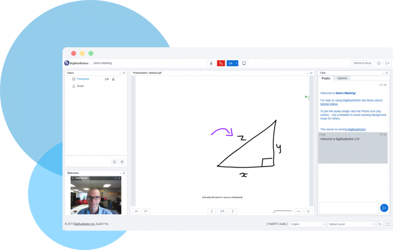 BigBlueButton شما را قادر می سازد صوت ، اسلایدها ، گپ ، ویدئو و دسک تاپ خود را با دانش آموزان به اشتراک بگذارید