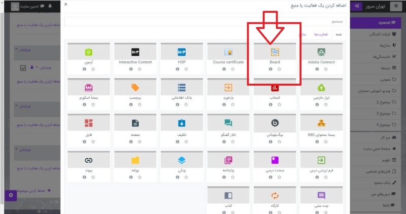 پس از نصب افزونه Board، معلم می تواند به “اضافه کردن یک فعالیت” رفته و فعالیت Board را انتخاب کند.