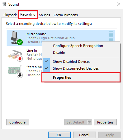 روی میکروفن مورد نظر خود و انتخاب گزینهی Properties و رفتن به تب Levels نیز میتوانید بلندی صدای