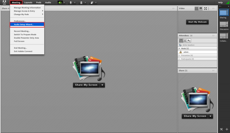 صدا را دریافت کنید. برای این کار کافی است از منوی بالای نرمافزار بر روی گزینهی Meeting کلیک کنید و