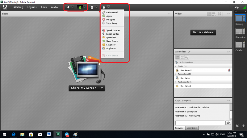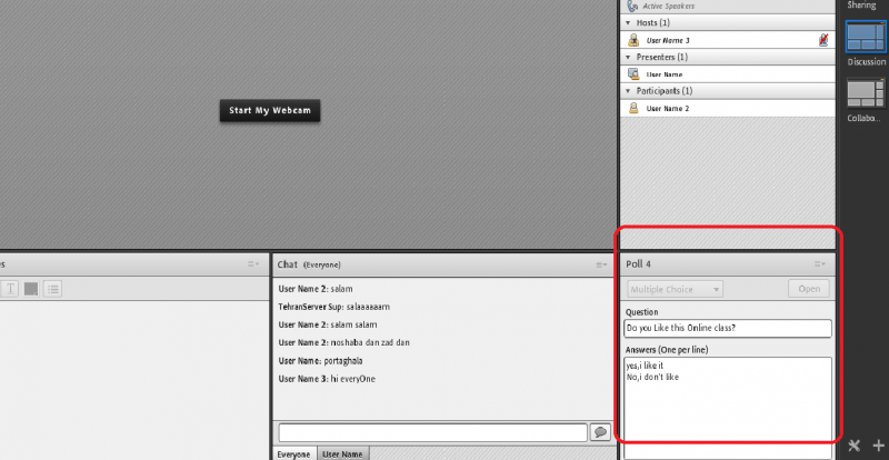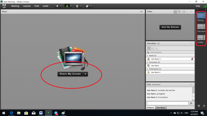 همانطور که در عکس بعدی مشاهده میکنید شما اگر به عنوان host باشید میتوانید از گوشه سمت راست بالا صفحه نرم افزار ادوبی کانکت خودرا تغییر دهید.واز حالت sharingبه حالت discussin یا collabo.. تغییر دهید.