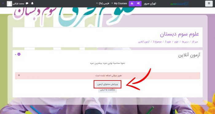 امتحان آماده باشد. به همین منظور باید وارد درس مورد نظر خود شوید و آزمونی که طراحی کردهاید را