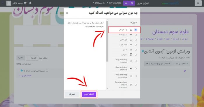 همانطور که گفتیم، مودل قدرت برگزاری انواع آزمونها را دارد. شما با انتخاب گزینهی اضافه کردن سوال