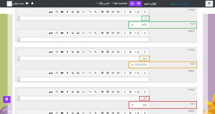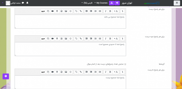 در قسمت بازخوردها میتوانید برای هر نوع از جوابها یک نوع بازخورد مشخص کنید. برای مثال اگر