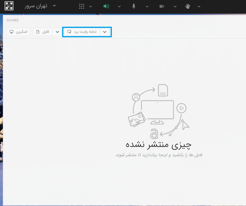 فلش سمت پایین که با کادر قرمز نشان داده شده است را کلیک کرده و گزینه ی share whiteboard را انتخاب نمایید.