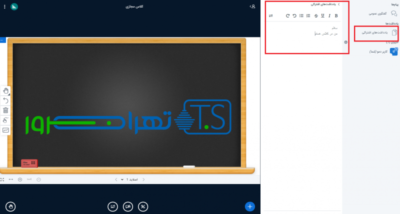 Shared Notes یا یادداشت های اشتراکی به کاربران این امکان را می دهد تا در جلسه خود با سایرین (شاگردان و معلم) به صورت پیامی صحبت کنند و یا پاسخ یکدیگر را بدهند.