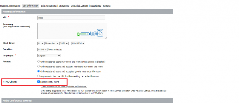 اگر از کاربران پلان اختصاصی ادوب کانکت هستید، این امکان برای شما وجود دارد تا ورود با اپلیکشن را در پنل خود اجباری نمائید. معمولا برای اینکار میتوانیم در تنظیمات هر meeting گزینه Enable HTML client را غیرفعال نمائیم.