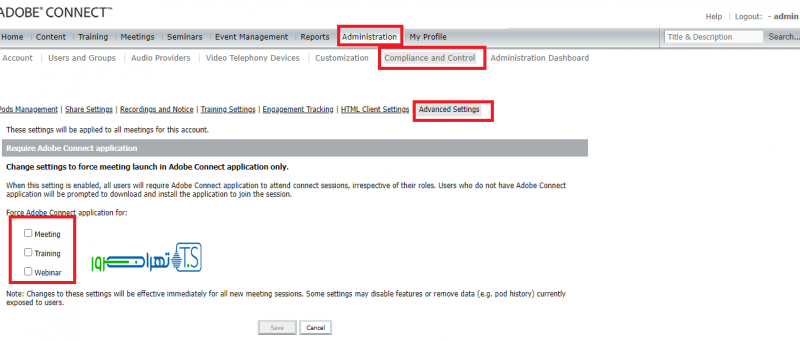 و در قسمت Force Adobe Connect application  میتوانید انتخاب نمائید که ورود اجباری با نرم افزار در کدام یک از این محیط ها (کلاس ها، وبینار و …. ) اعمال گردد.