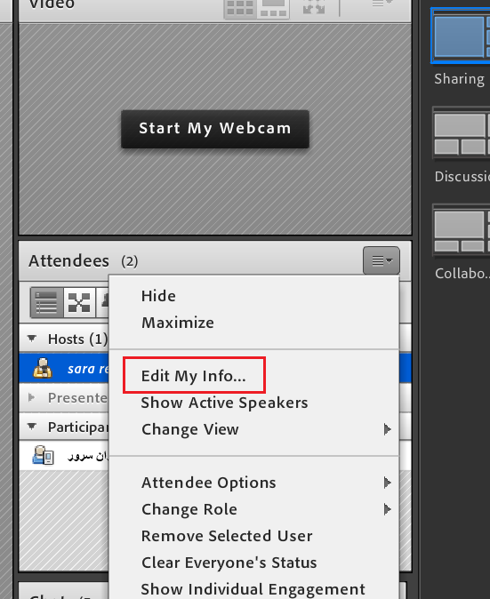 میتواند در کلاس درس ادوبی در قسمت پاد attendees بر روی گزینه …edit my info نام خود را تغییر دهد.