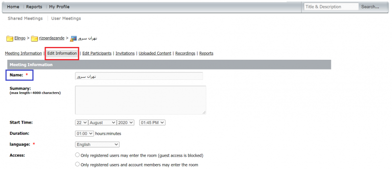اگر پلان شما اختصاصی است  میتینگ مورد نظر را انتخاب کرده و بر روی نام کلاس کلیک کنید و از edit information تغییر دهید.