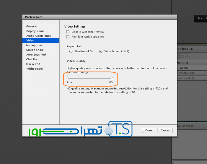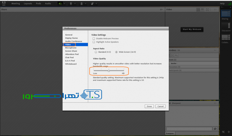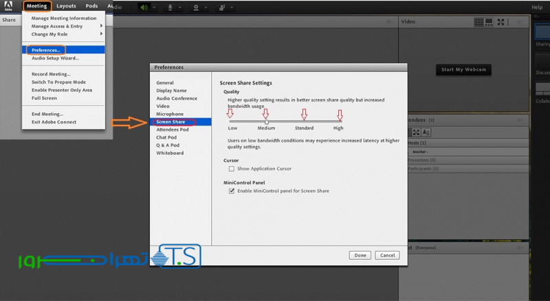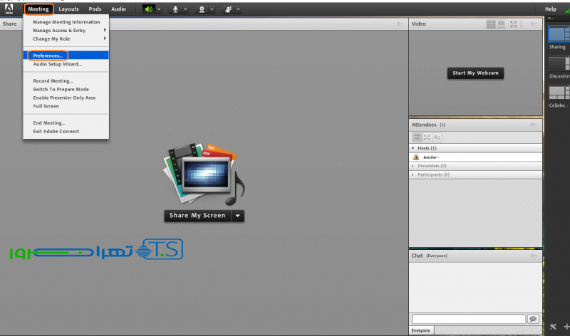 دقت کنید: زمانی که وارد کلاس ادوب کانکت می شوید و می خواهید وبکم به اشتراک بگذارید، بهتر است وارد قسمت منوی کلاس meeting شوید و گزینه preferences را انتخاب نمایید