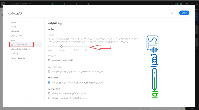 تنظیم کیفیت از طریق مرورگر و در ادوب کانکت فارسی را نیز می توانید به کمک تصاویر زیر انجام دهید: