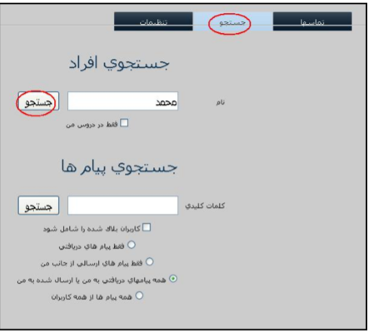 ﮔﺰﻳﻨﻪ ﻱ ﺟﺴﺘﺠﻮ ﺭﺍ ﺍﻧﺘﺨﺎﺏ ﻛنید. ﺩﺭ ﭘﻨﺠﺮﻩ باز شده ﺩﺭ ﻗﺴﻤﺖ ” ﺟﺴﺘﺠﻮﻱ ﺍﻓﺮاد” ﻧﺎﻡ ﻓﺮﺩ ﺭﺍ بنویسید ﻭ ﺑﺮ ﺭﻭی ” ﺟﺴﺘﺠو” ﻛﻠﻴﻚ ﻛنید.