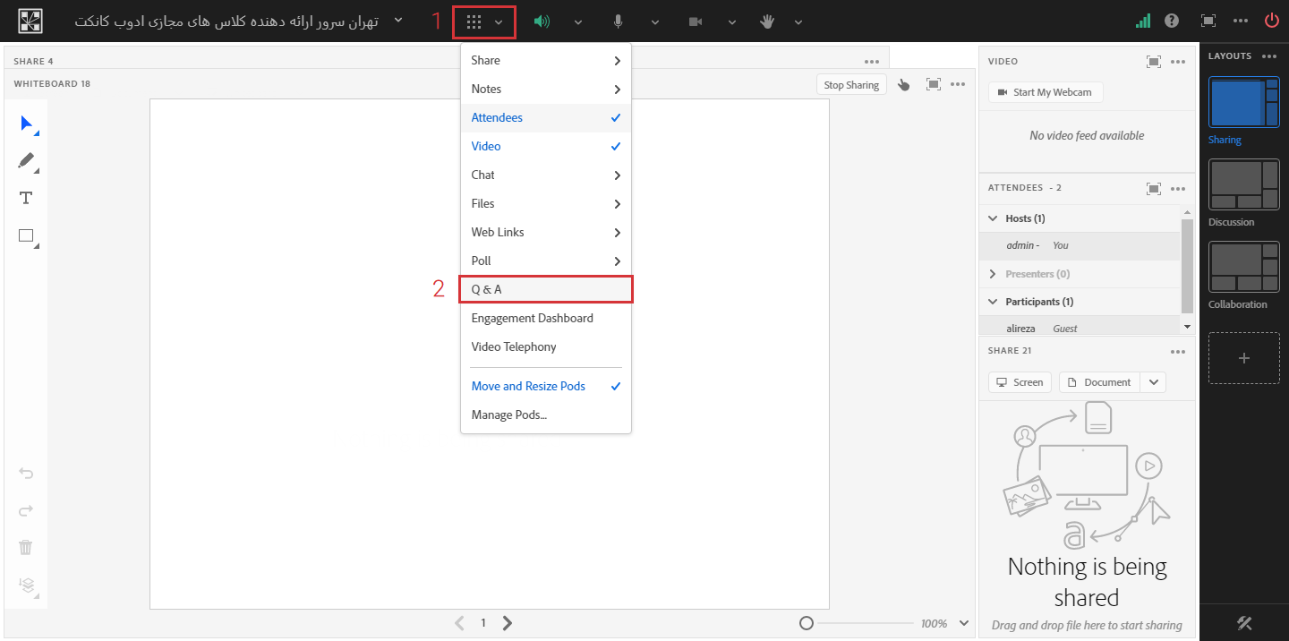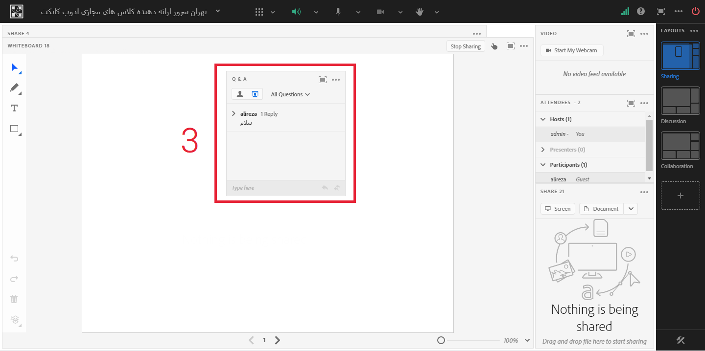شده بر روی Q&A (شماره ۲) کلیک کنید تا پاد پرسش و پاسخ برای شما فعال شود (شماره ۳).