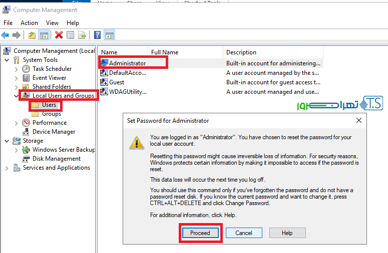 - برروی administrator راست کلیک کرده و سپس گزینه set password را به جهت تغییر پسورد انتخاب نمایید. و در نهایت proceed را بزنید.