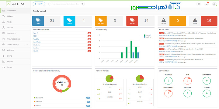 گزینه بعدی ما Atera است که اگر در زمینه شبکه فعالیت کرده باشید بی شک با آن آشنا هستید. این سیستم به نوعی ابرمحور است و به شما اجازه نظارت لحظه ای شبکه ها را می دهد. مزیت این نرم افزار مدیریت و نظارت از راه دور (RMM) است. شما می توانید با استفاده از این نرم افزار بر طیف ظرفیت شبکه خود به صورت کامل نظارت داشته باشید. علاوه بر این نظارت بر سرور وب، ایمیل و پایگاه داده ها را نیز برای شما آسان می کند.